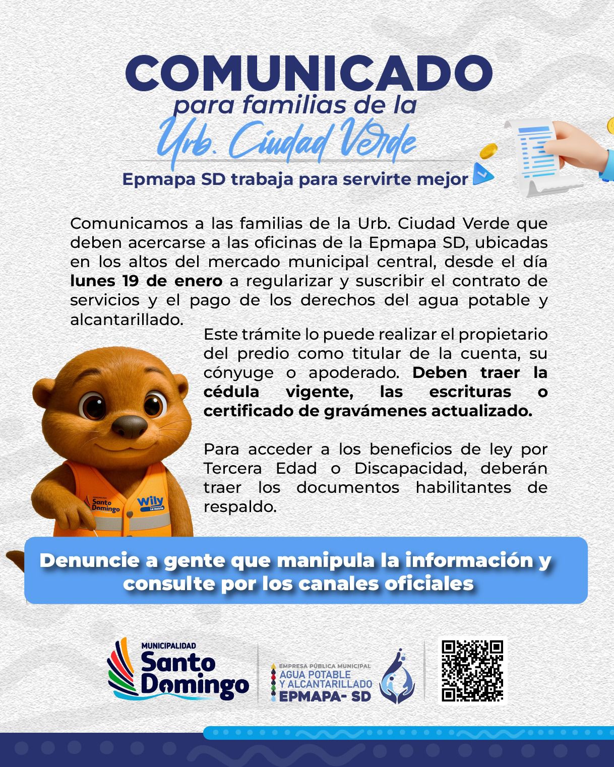 De conformidad con la Ley Orgánica de Protección de Datos Personales de Ecuador, informamos que los datos personales proporcionados en este registro, los cuales serán tratados de manera confidencial y utilizados para el proceso deliberativo de Rendición de Cuentas 2024 de la Empresa Pública Municipal de Agua Potable y Alcantarillado de Santo Domingo. Sus aportes ciudadanos serán receptados a través del siguiente formulario: